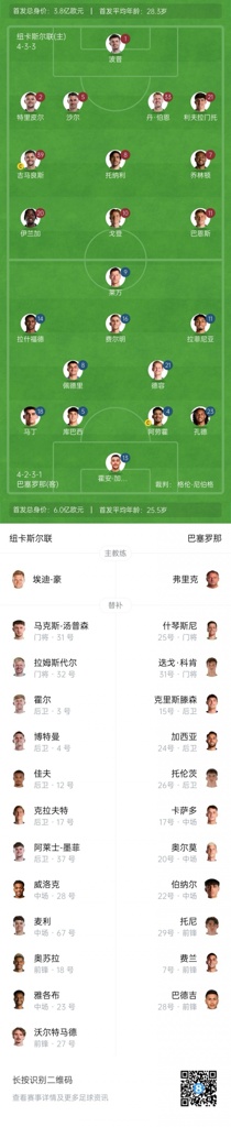 9月19日讯 欧冠联赛阶段第1轮,纽卡对阵巴萨,赛前首发公布。亚马尔本场继续伤缺,沃尔特马德替补。